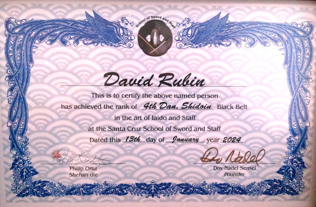 David has studied the Bahala Na Style of Filipino Martial Arts in Monterey Bay with Guro David Hines, Guro Sherwin Fernandez and Guro Erickson Osian from 2018 to 2023. This training has further enriched his martial arts repertoire, complementing his extensive background and enhancing his teaching at the School of Sword and Staff.