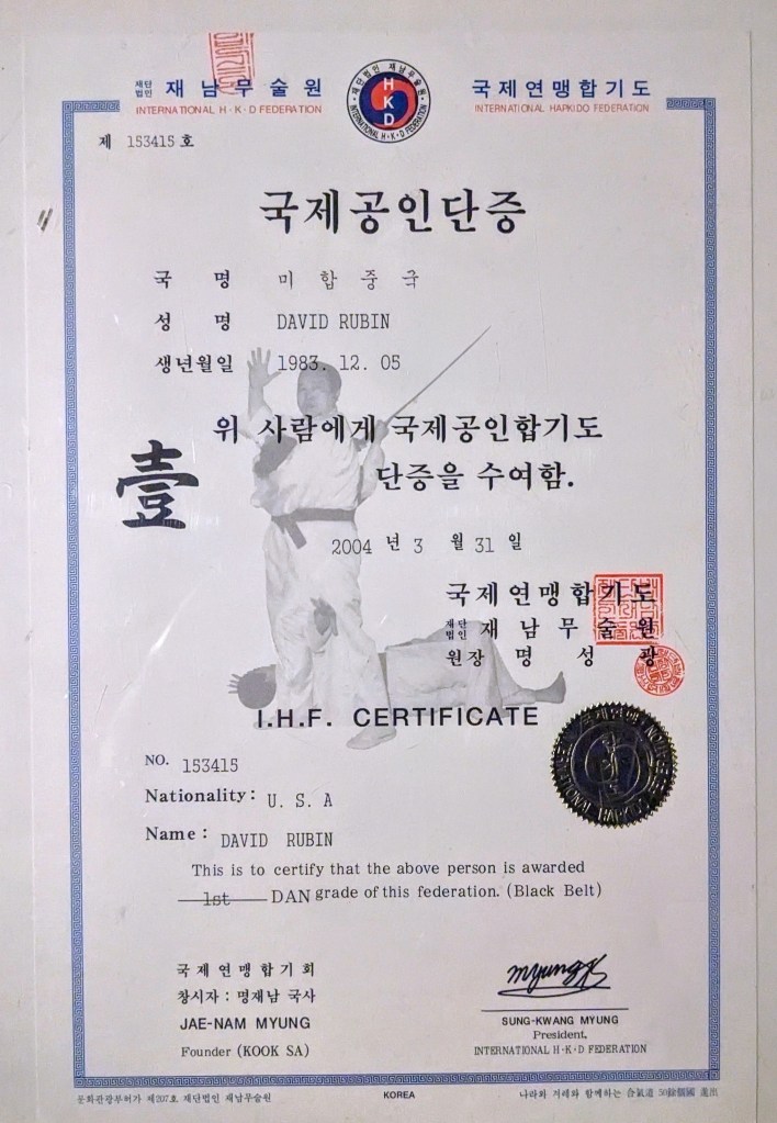 David Rubin Sensei has been practicing and studying martial arts since 2001, beginning his journey in Tae Kwon Do and Hap Ki Do in Los Angeles. During this time, he earned his Shodan (1st Dan) in Hap Ki Do, laying a strong foundation for his continued martial arts development.